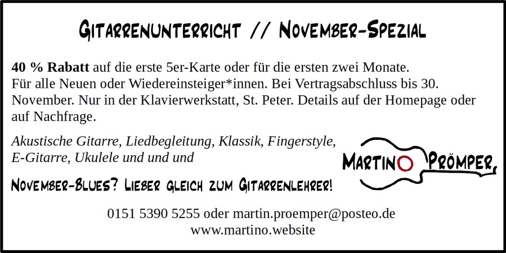 Veröffentlicht am 4. November 2022 von Martino04.11.2022: Gitarrenunterricht St. Peter // November-Spezial Kommt in meine neuen Räumlichkeiten, in die Klavierwerkstatt St. Peter! Es ist schön hier!!