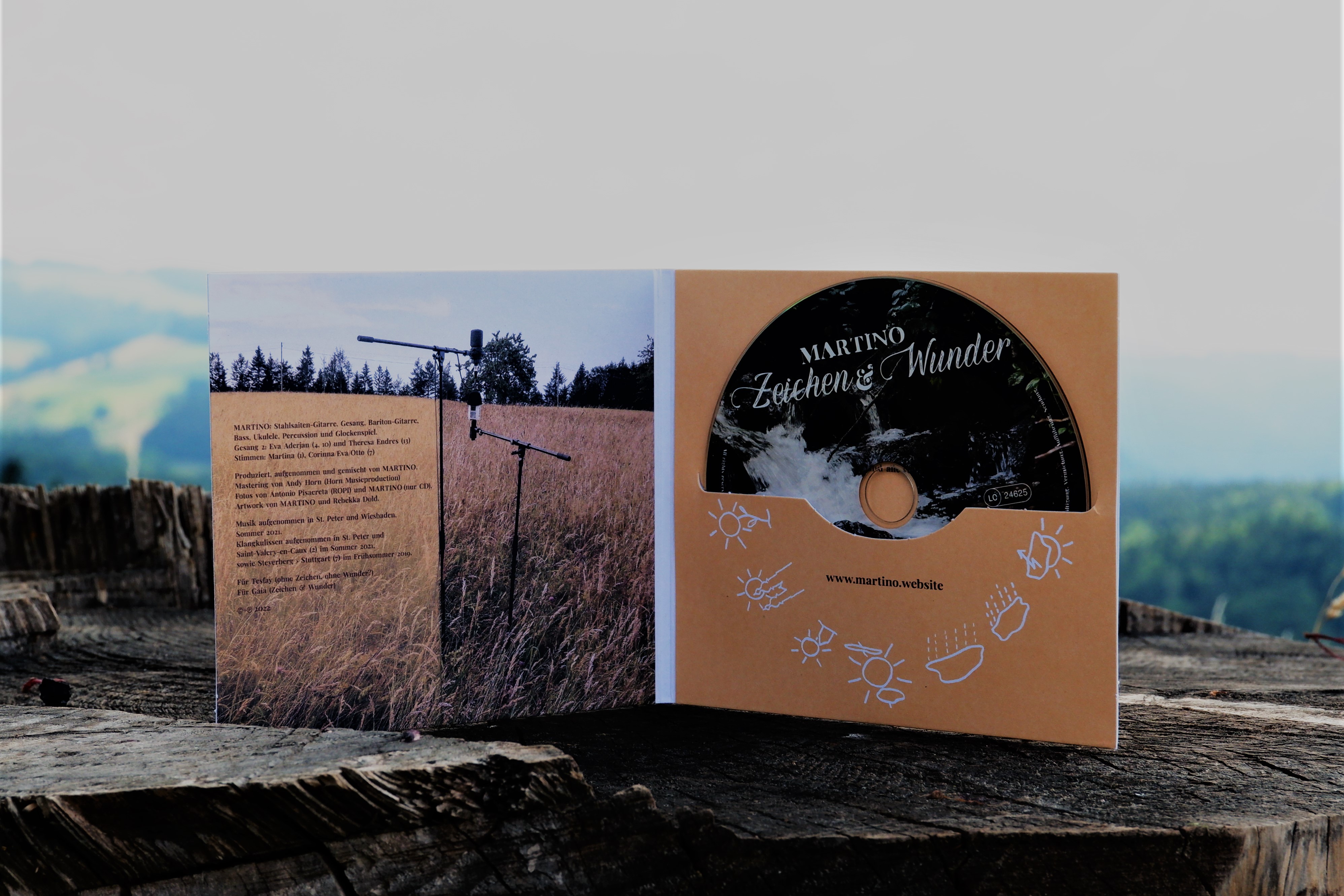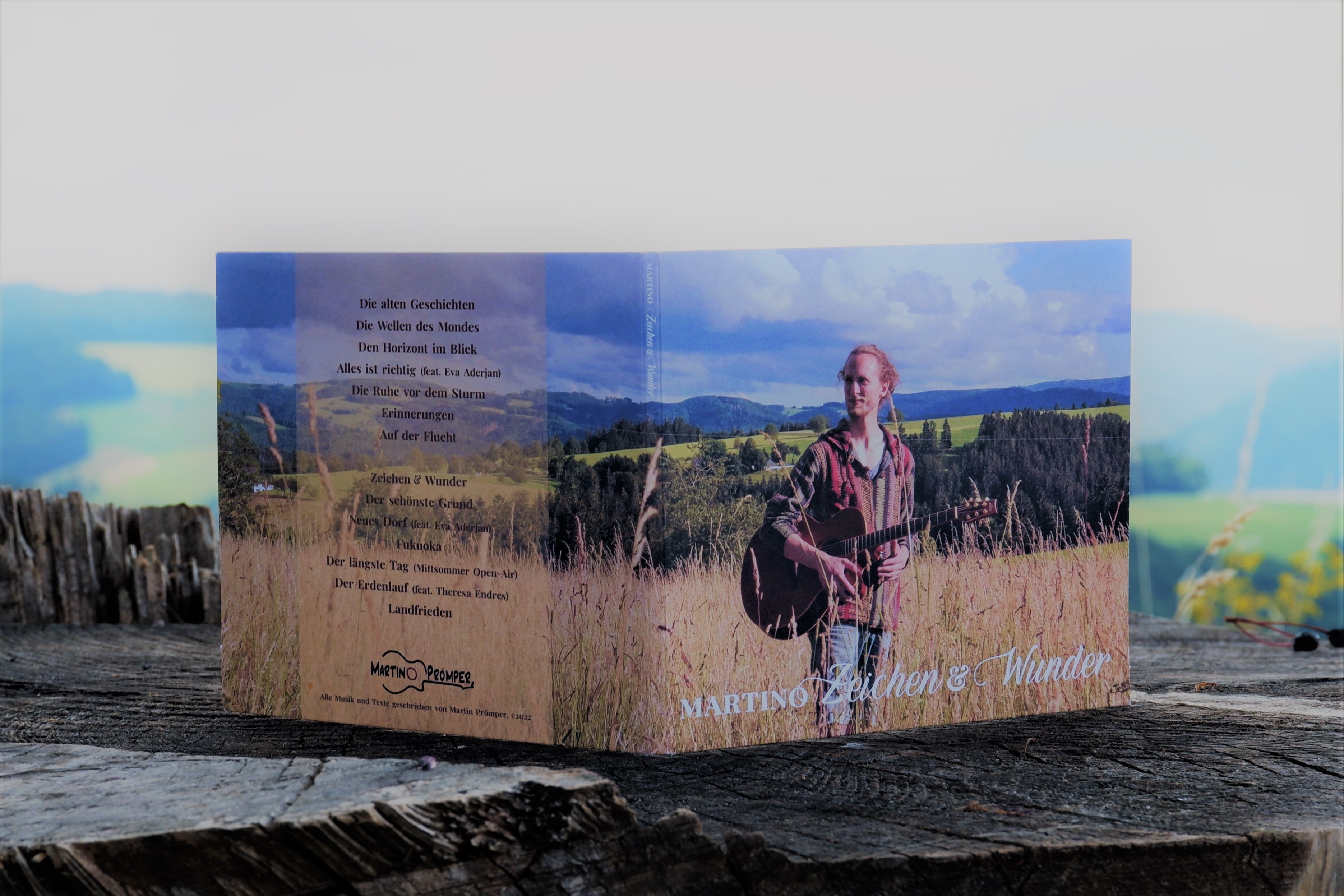Mitsommer 2018. Der Himmel ist sternenklar. Die Luft ist erfüllt vom Gesang der Zikaden. Der Boden immer noch warm. Ein Hinterhofkonzert vor Freunden. Verhallte Klänge einer akustischen Gitarre: „Ode an die Sonne … langes, großes Wirbeln … kann es überhaupt enden?“ (12 Der längste Tag) Nun, fast 4 Jahre später, manifestiert sich diese Klangskizze im Debüt-Album „Zeichen & Wunder“ des Sängers und Gitarristen Martino. Die 70-minütige Studio-Produktion verbindet deutschen Folk, Modern Fingerstyle und Klangkulissen der Natur zu einer ausdrucksstarken Hommage an das Leben – und an den Sommer.